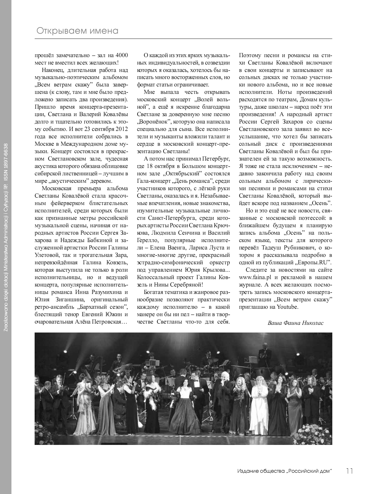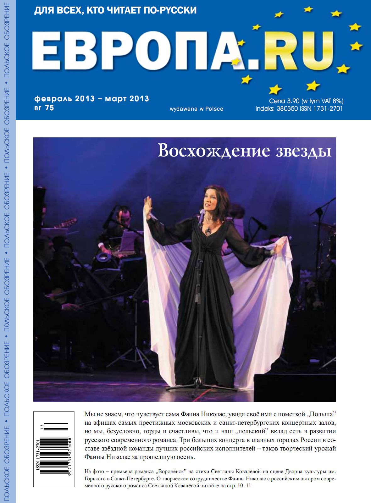 Но и это ещё не все новости, связанные с московской поэтессой: в ближайшем будущем я планирую запись альбома „Осень” на польском языке, тексты для которого перевёл Тадеуш Рубникович, о котором я рассказывала подробно в одной из публикаций „Европы.RU”. Следите за новостями на сайте www.faina.pl и рекламой в нашем журнале. А всех желающих посмотреть запись московского концерта-презентации „Всем ветрам скажу” приглашаю на Youtube.