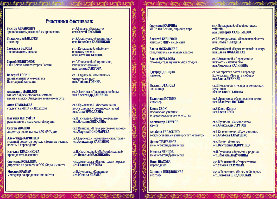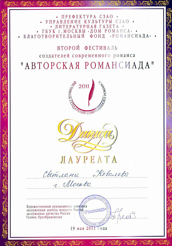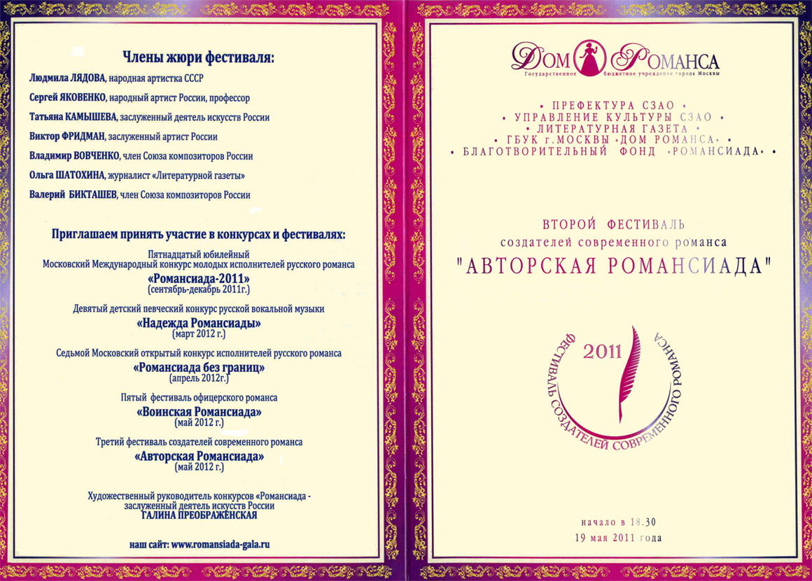 Сергей Белоголов , написавший музыку к обоим романсам представленным на фестиваль, получил «Специальный Диплом Жюри» за романс «Я припомню, как пахнут левкои».