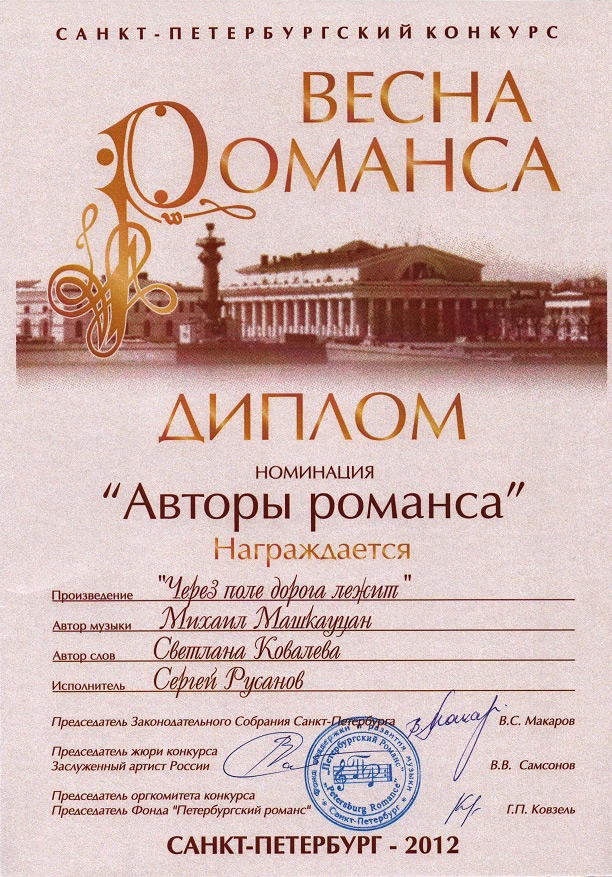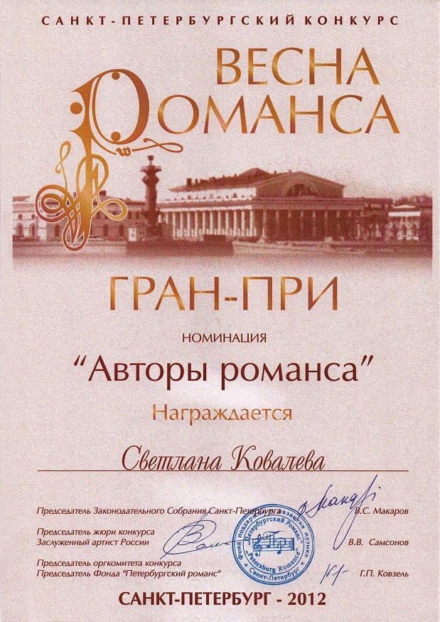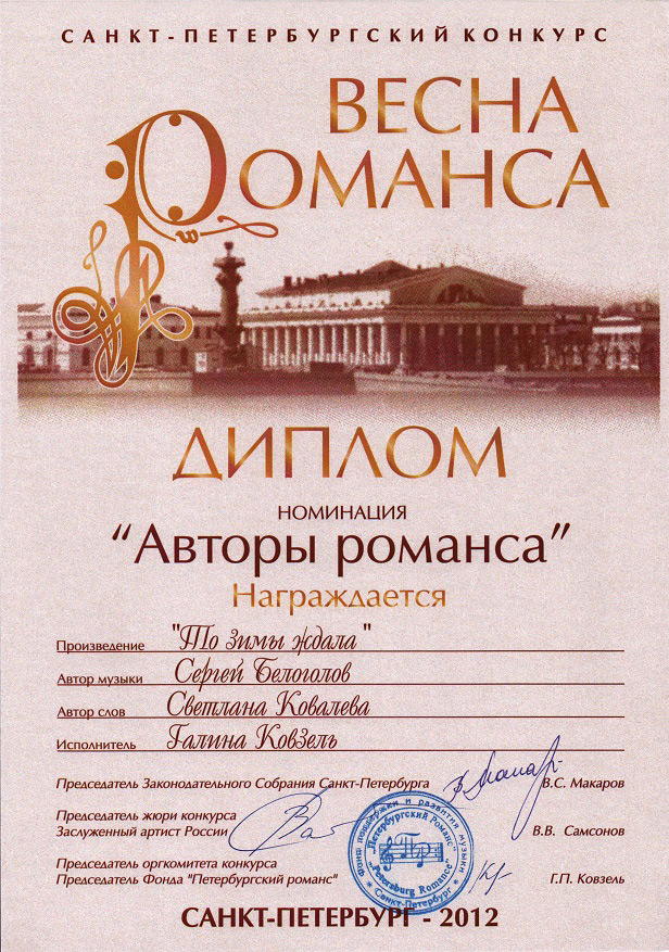 19 апреля 2012 года в Санкт-Петербурге в БКЗ "Октябрьский" состоялся заключительный Гала-концерт конкурса исполнителей и авторов романса "Весна Романса" - 2012. Председатель оргкомитета Конкурса, Председатель Фонда "Петербургский романс"- Галина Ковзель.