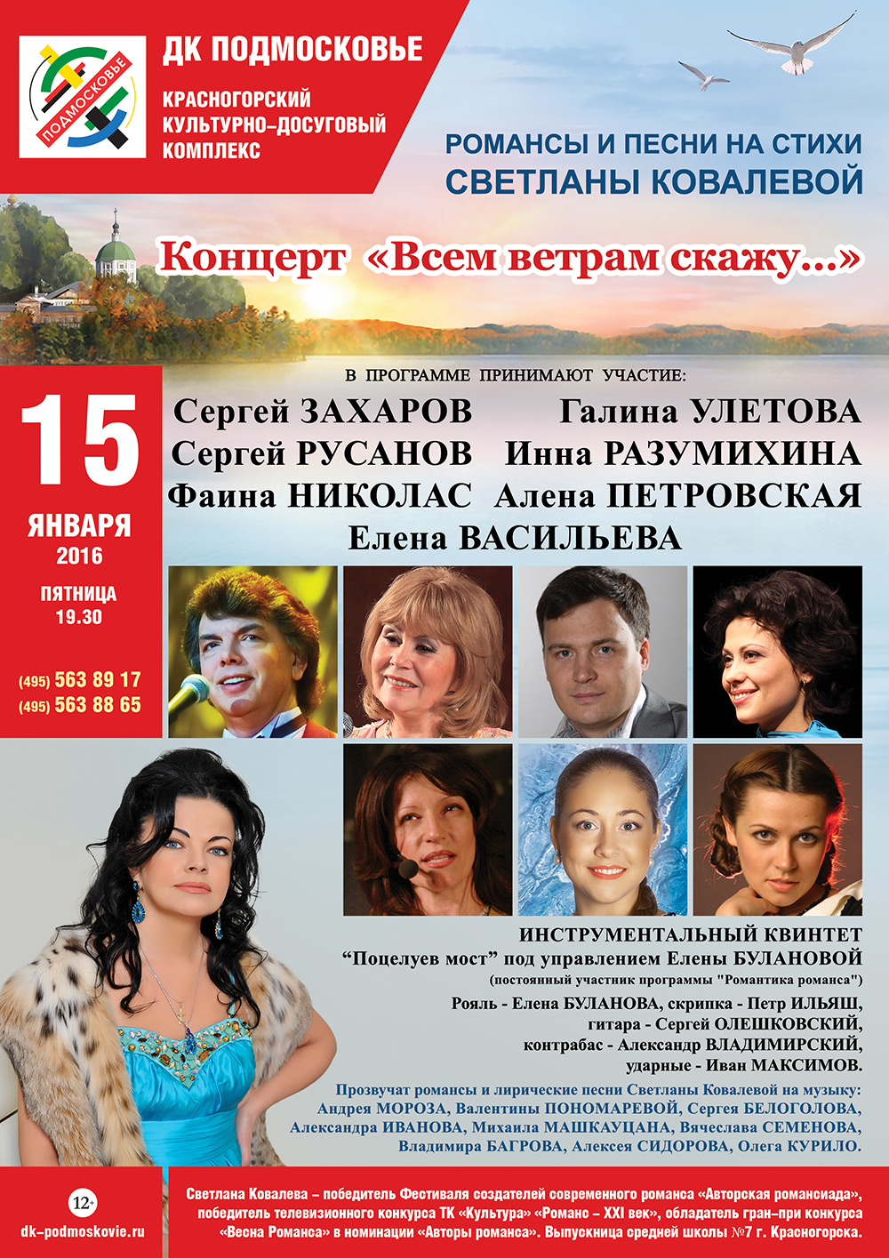 Рады сообщить о предстоящем Концерте «Всем ветрам скажу...» - лирические песни и романсы на стихи Светланы КОВАЛЕВОЙ, который пройдет в Красногорске (на Родине Светланы) 15 января 2016 года.