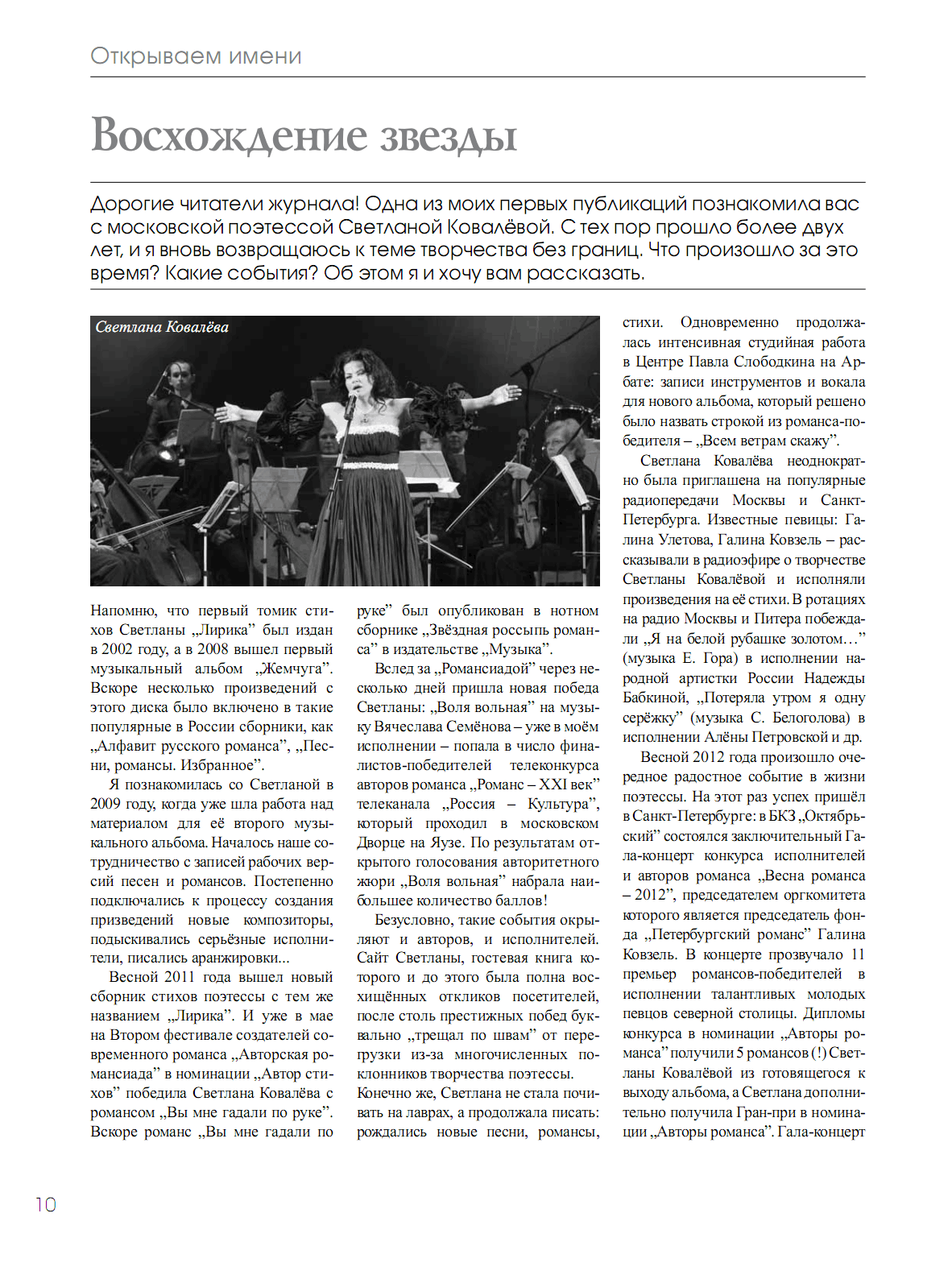 Напомню, что первый томик стихов Светланы „Лирика” был издан в 2002 году, а в 2008 вышел первый музыкальный альбом „Жемчуга”. Вскоре несколько произведений с этого диска было включено в такие популярные в России сборники, как „Алфавит русского романса”, „Песни, романсы. Избранное”.