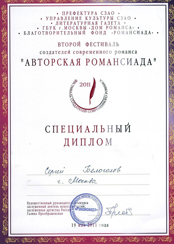 Сергей Белоголов , написавший музыку к обоим романсам представленным на фестиваль, получил «Специальный Диплом Жюри» за романс «Я припомню, как пахнут левкои».