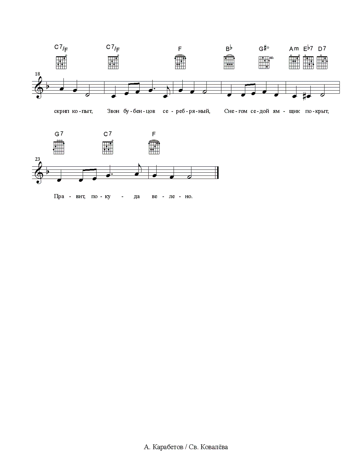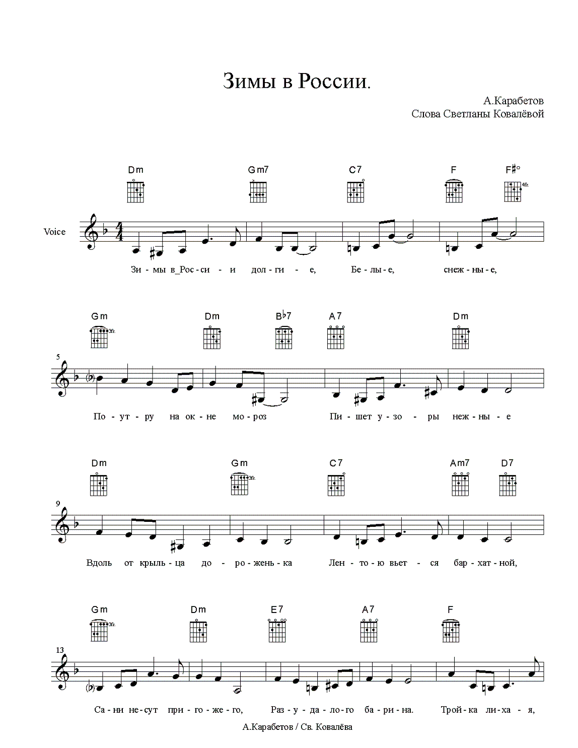 Зимы в России долгие, Белые, снежные, Поутру на окне мороз Пишет узоры нежные Вдоль от крыльца дороженька Лентою вьется бархатной, Сани несут пригожего, Разудалого барина. Тройка лихая, скрип копыт, Звон бубенцов серебряный, Снегом седой ямщик покрыт, Правит, покуда велено. Сердце в груди у девицы Стукнуло, оборвалося, Вот и гадает девица Любит, иль забавляется Выйди-ка за околицу, Да не грусти, лебедушка Бог даст, он и воротится Барин-сорвиголовушка. Зимы в России долгие, Белые, снежные Поутру на окне мороз Пишет узоры нежные.