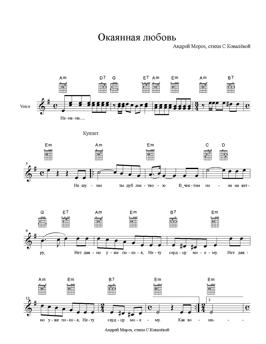 Не шуми ты дуб листвою В чистом поле на ветру, Нет давно уже покоя, Нету сердцу моему. Как водила к водопою Белогривого коня Загляделся чернобровый Парень бравый на меня. Здравствуй, красная девица, Здравствуй милая душа На тебя дай подивится До чего ж ты хороша. Запылали мои щечки, Сердце вспыхнуло в груди, Я сказала – «К быстрой речке Хорошо вдвоем идти». И играла до заката Молодая наша кровь, В том одна лишь виновата – Окаянная любовь. Не шуми ты дуб листвою В чистом поле на ветру, И с тех пор уж нет покоя, Нету сердцу моему.